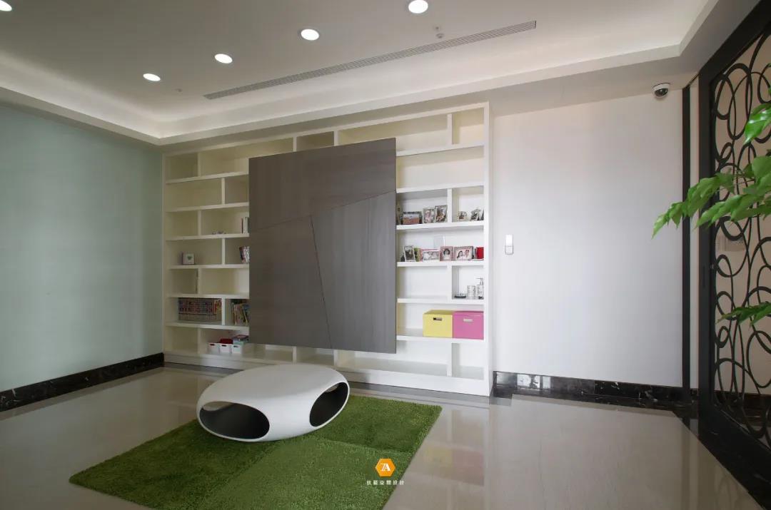 由玄關向前行進,來到的第一個房間便是多功能區域,作為為這個家庭小孩預留出來學習與活動的空間,因此,在空間之中並沒有擺放過多的家具,而是以留白的形式,讓大人與小孩一同構築這一空間,同時,設計師在空間之中設計了一個可以拼合門板的書櫃,獨特的造型,為這一空間增添了無限趣味。