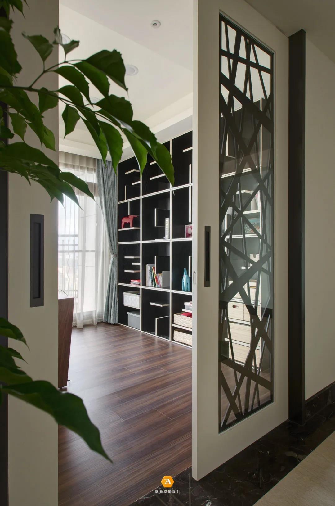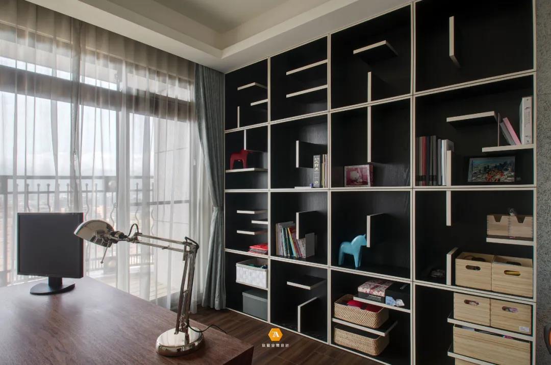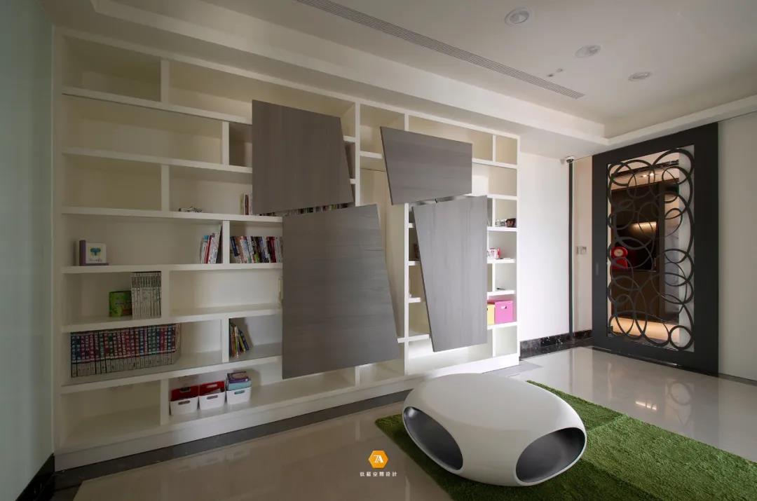 穿過多功能房,接下來便來到了書房。考量到大人對小朋友的照料以及工作的關系,因此設計師在空間的規劃上,將書房既多功能區域設置在相鄰的兩個空間,讓大人在辦公的同時,也能夠估計到小朋友的情況,增加了空間的互動性。而以幾何線條組建的書櫃,則為空間帶來幾分時尚現代的氛圍感受,透露出幾何所賦予的美。