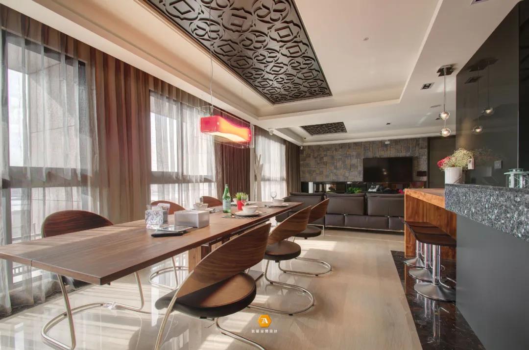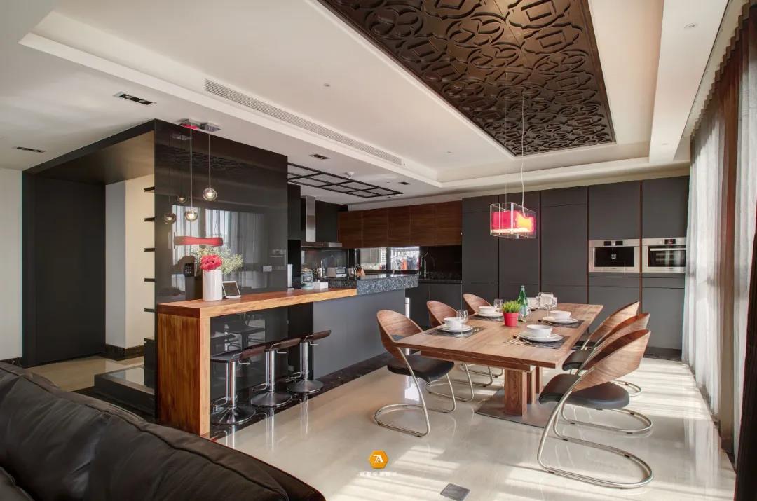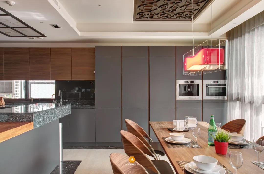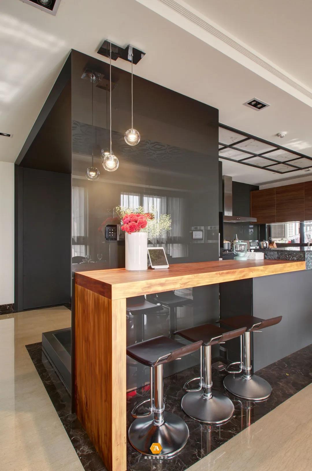 廚房以開放式的概念設計,藉由光線的照射,增加視覺的延伸,擴大了空間感受;而灰黑色的櫥櫃門板與木飾面搭配,則讓廚房空間顯得格外時尚,凸顯品味;吧臺以及餐桌的結合,則是為了讓業主,無論是在人多亦或是人少的情況下,都能有合適的場景應對,完備空間功能需求。