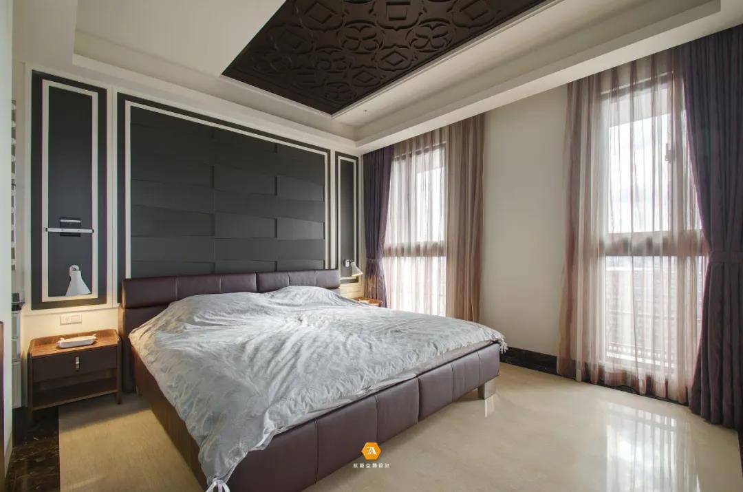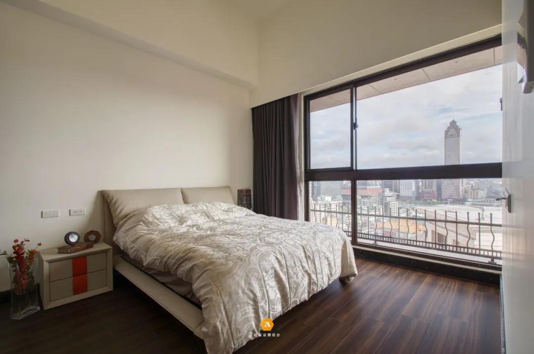 在主臥與次臥的設計上,設計師以兩種不同的氛圍來營造空間。主臥延用客餐廳的藝術天花,同時結合富有層次的床頭背景墻,營造出一種踏實安穩的氛圍基調,使人置身空間之中,便能遺忘生活所帶來的煩擾,安心入睡。而次臥與主臥的感受卻截然不同,寬敞明亮、簡約舒心是對這一空間的最佳形容,沒有過多的造型修飾,簡簡單單,搭配深色木地板與大面積落地窗,無論是白天或是晚上,在這一空間,都是極致的享受。