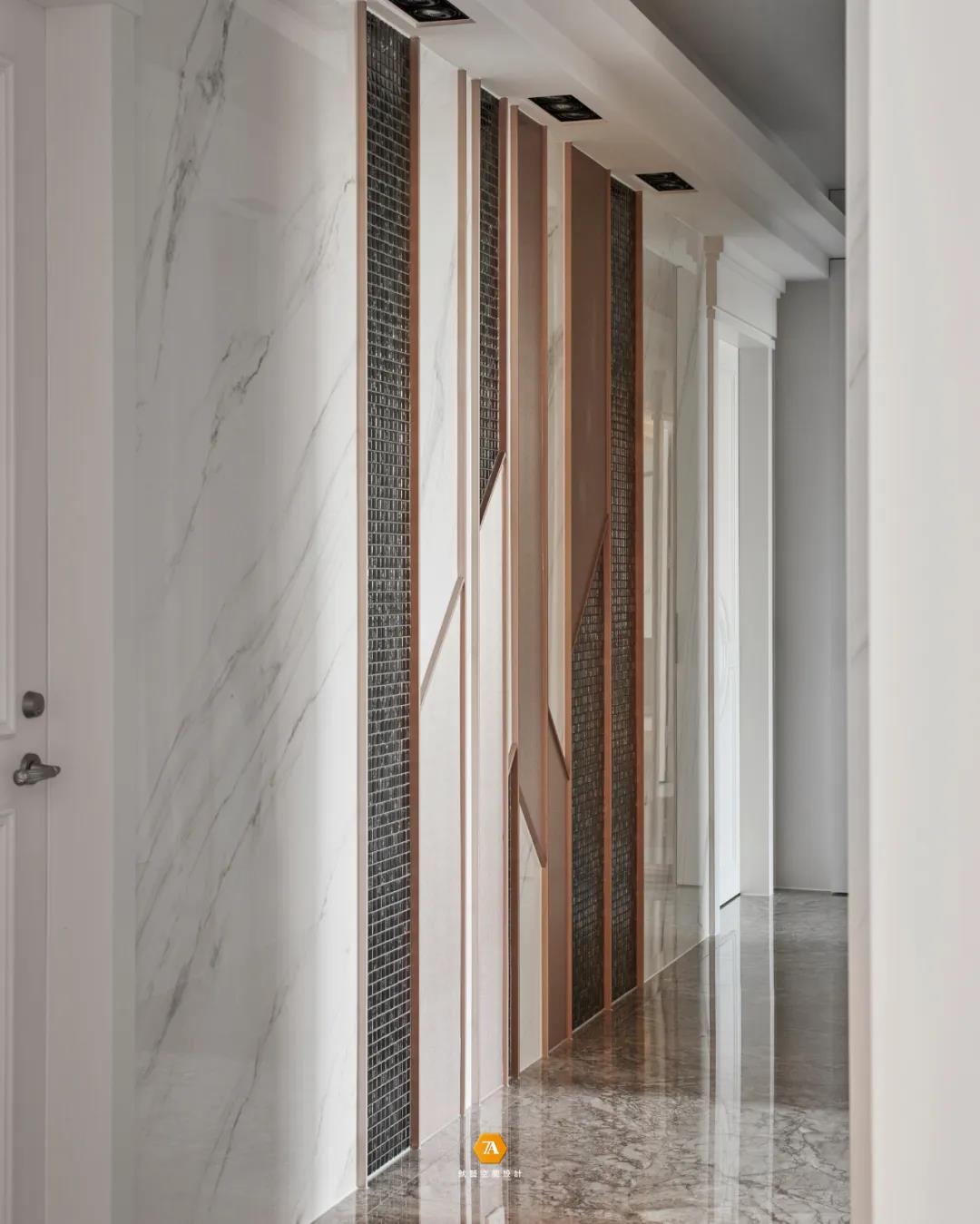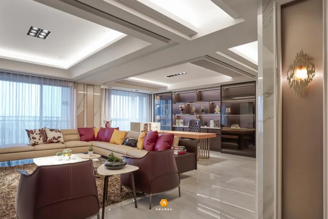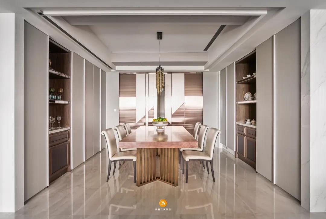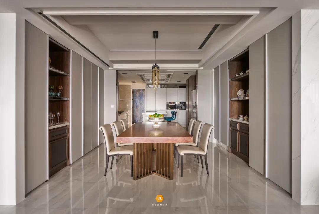 與以往封閉式的書房不同,設計師不認為封閉是一種寧靜,真正的寧靜應該是不受空間格局影響的 ,環境氛圍的營造,才是主導安逸恬靜的重要因素;因此,設計師於本案中采用開放式書房的設計,打破空間格局限製,延伸廣闊視覺,去除空間擁擠所帶來的壓迫感,為業主帶來輕松無壓的身心感受;書房區域一整面的玻璃展示櫃與金屬木質書桌,則體現了業主時尚氣質的生活品味。