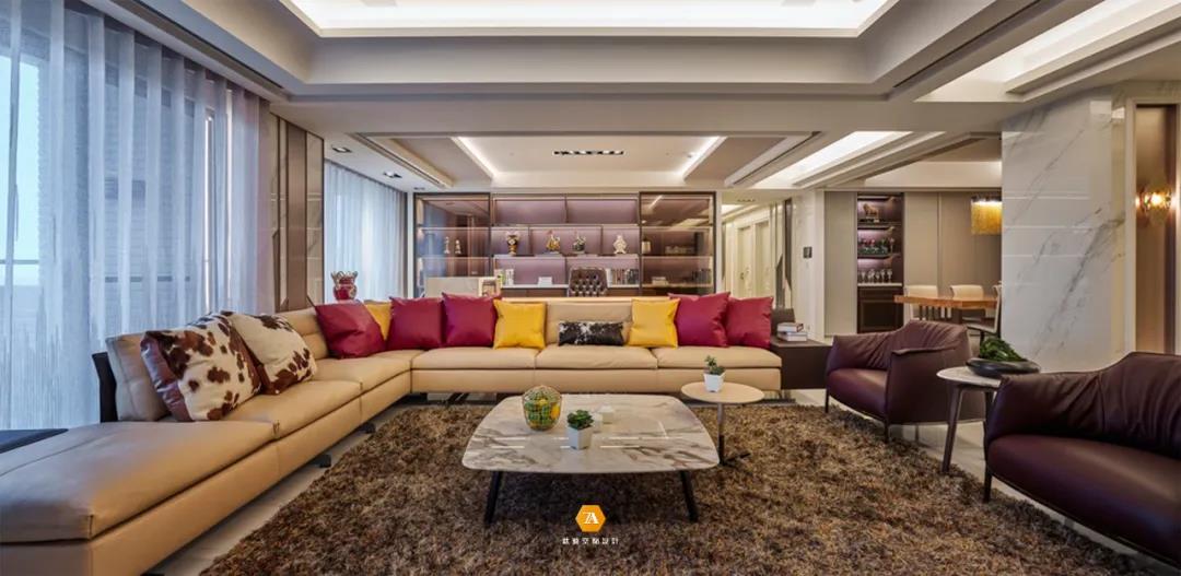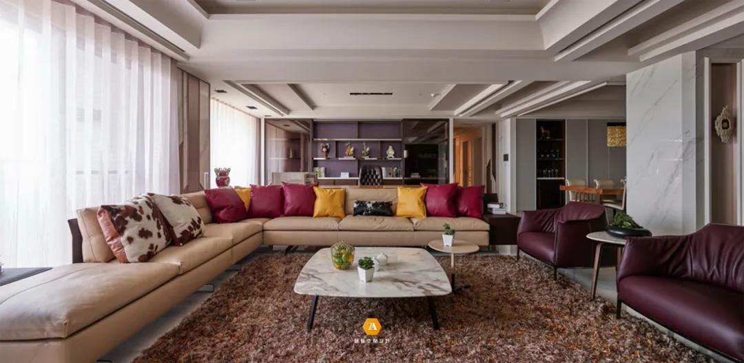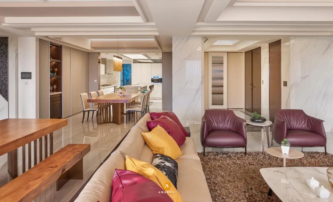 由玄關邁入客廳,寬敞明亮的區域顯現在眼前,廣闊的空間格局,讓緊繃的身體與精神得到放松;L型的多人沙發,讓整個空間更顯寬廣,業主可以以任意姿勢在空間中自由舒緩身心,或躺、或靠、或坐,不受約束,真正的沈靜在空間的享受之中;而紅黃抱枕與玫瑰金大理石墻面,則讓空間多了些活潑與時尚的氛圍。