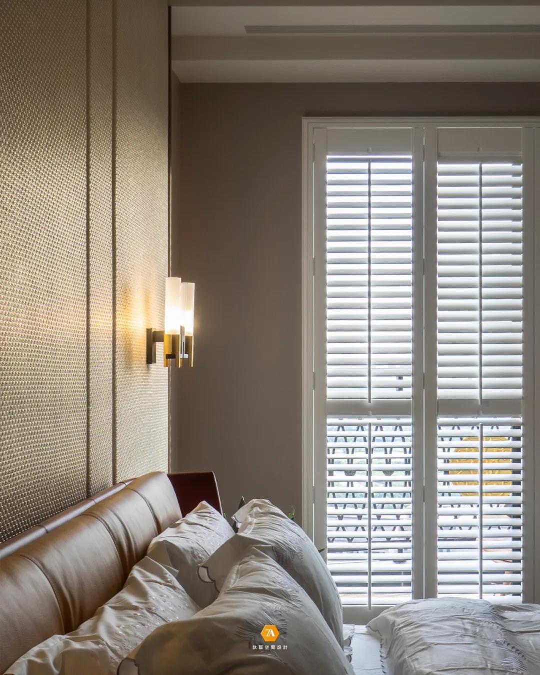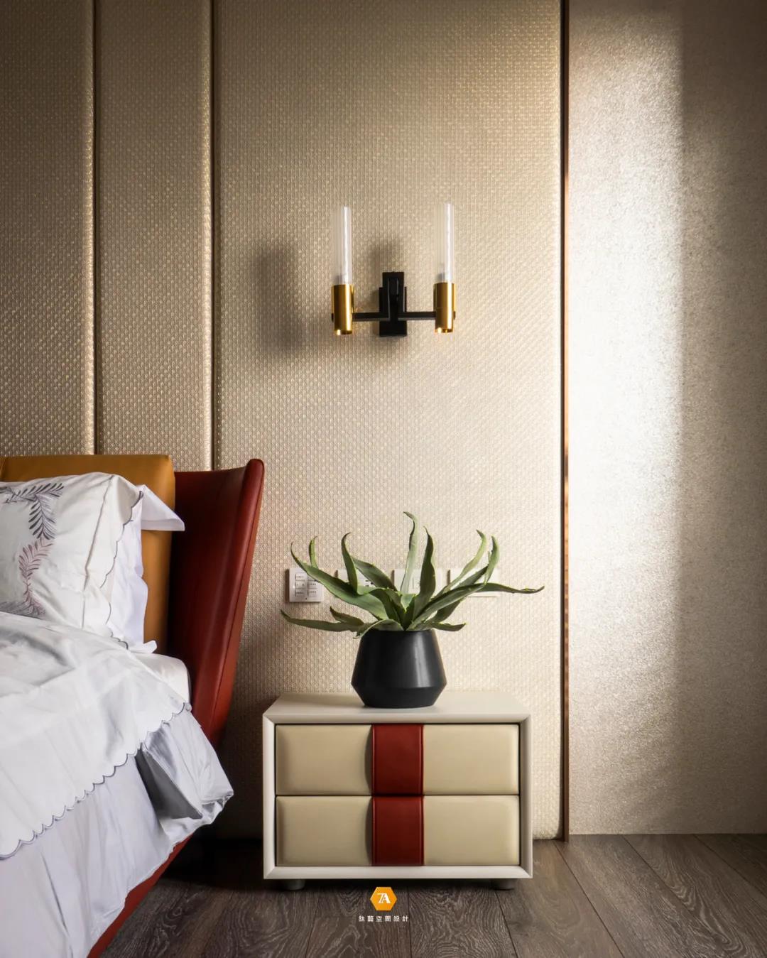 來到主臥,一種上世紀的年代氛圍成為走進空間的第一感覺;設計師以年代感作為空間主調,將業主出現代都市工作繁忙的壓力之中解放出來,回歸到上世紀舒緩的節奏,讓閑暇寧靜的時代感覺,伴隨著燈光熄滅,一同進入業主的夢鄉之中。
