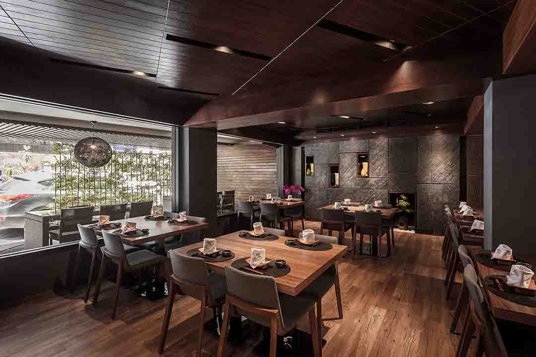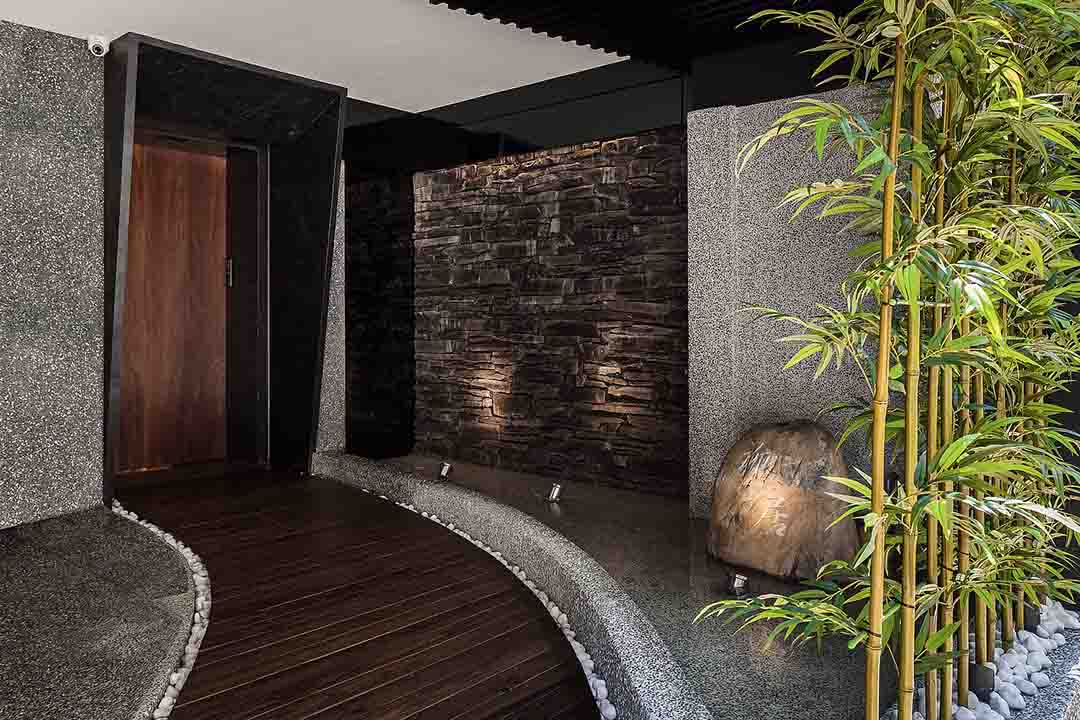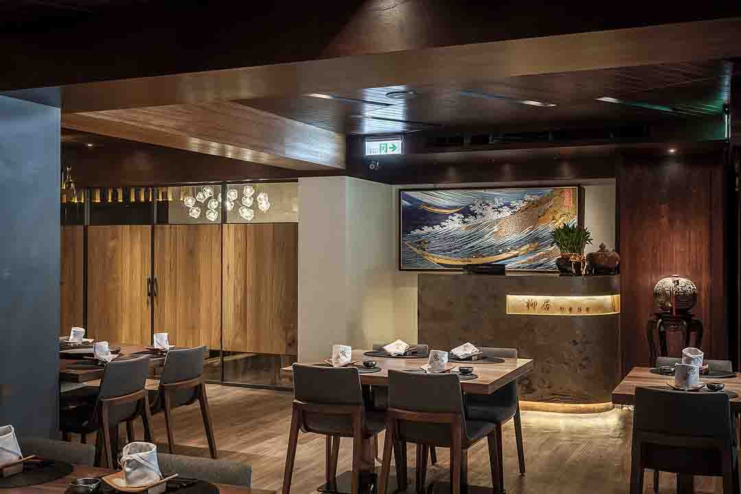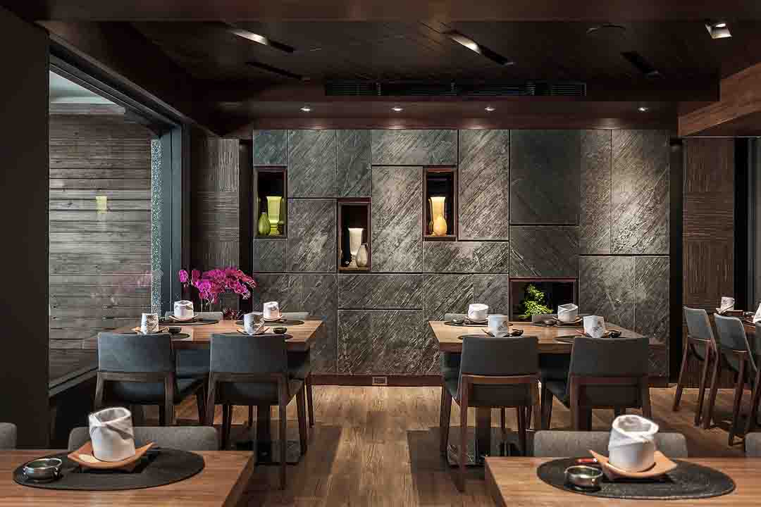 竹,自古以来无论是在日本,还是在中国,均以各种各样的形式而为人们所用。设计师回归自然本质的理念,在入口的两旁,栽种了满排的竹,在喧嚣的都市中,忽见一角竹影,嘈杂被退却了,换而一种安静。延着入口进去,深色木格栅天花与立面弧形相接,延伸了相对较小的空间,并使得更有层次感。石组墙面、衬着山水的玄妙凸显整体空间虽然小但不失精致。