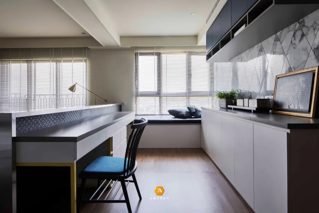 書房空間藉由不銹鋼矮隔墻構建出了超大尺度書桌,而窗邊的臥榻設計,不僅保留了側邊的室外采光,而且也讓屋主能在此處一邊感受陽光帶來的溫暖,一邊舒心的閱讀,讓身心更加自由自在的融入空間之中。而後側的書櫃則利用大片的大理石紋美耐板以菱格拼貼,創造出獨特的背景墻,與電視背景墻一同展現出黑與白的對話。