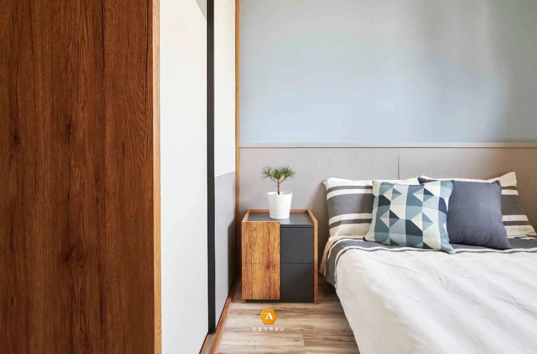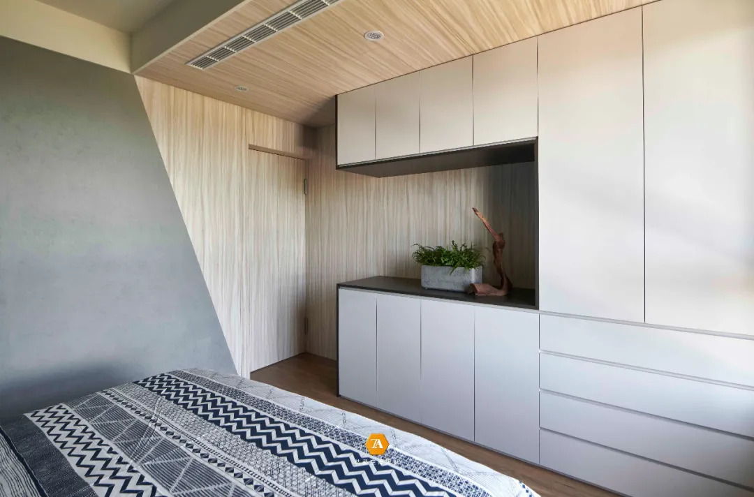 在臥房的設計上,則是使用亮眼的墻面配上沈穩清水模塗料,為空間增添質感上的變化。