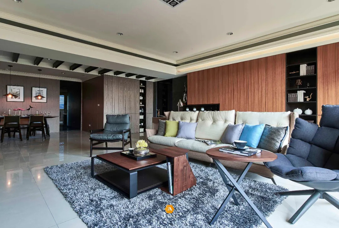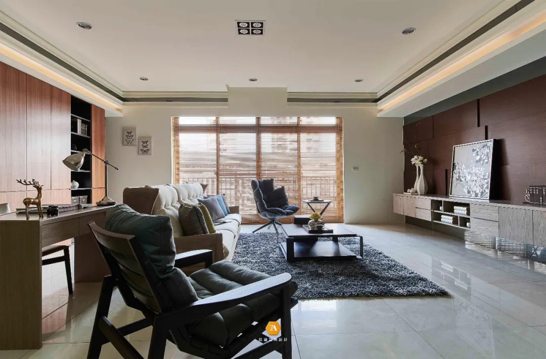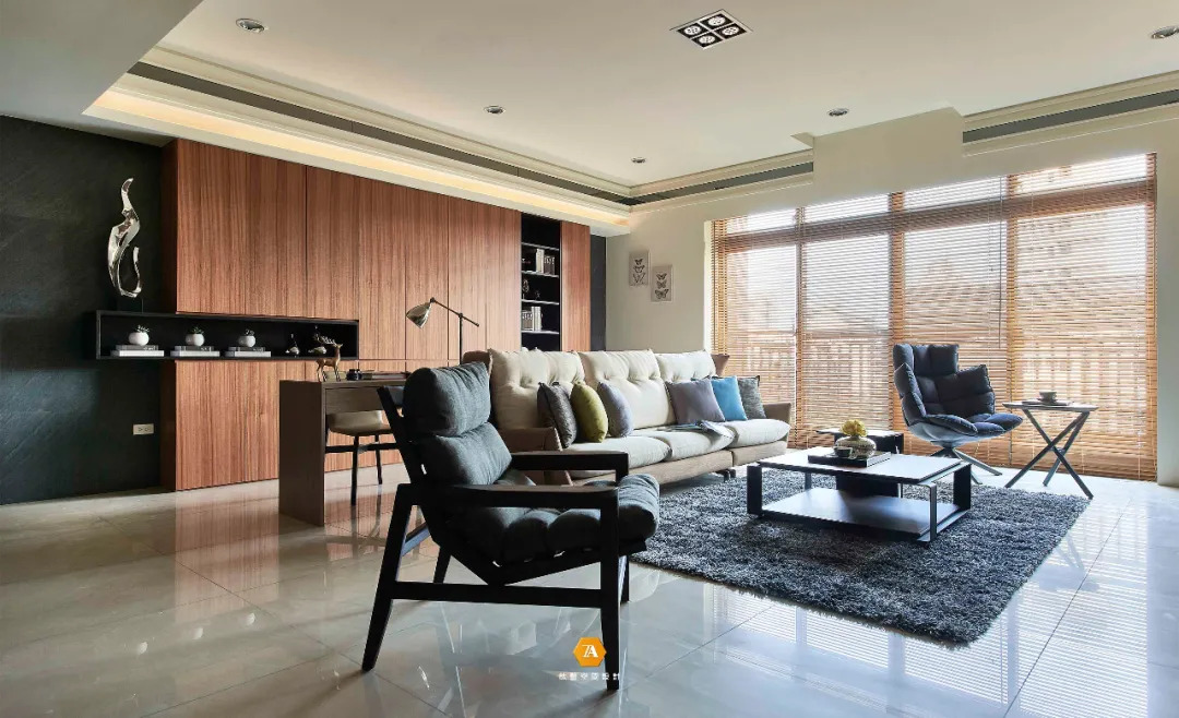 入口的前側就是公領域空間,後側則為臥房私領域。而公領域則由客廳、書房以及吧臺區域構成,以現代感線條構造此三個不同空間,,三處一體,卻又各自獨立。