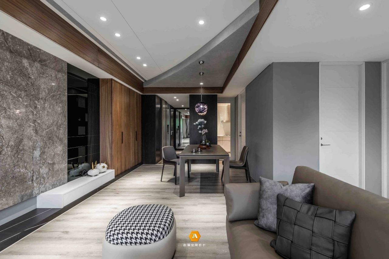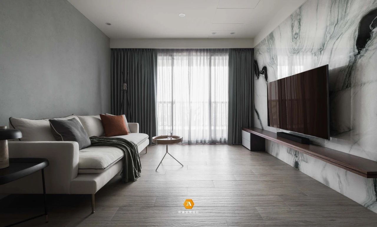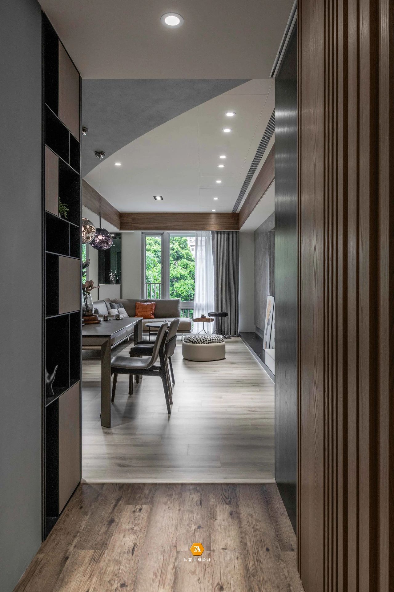 本案中,設計總監 周烜至 以簡約的質材為屋主打造了一個時尚溫馨之家,雖然沒有太多的裝飾造型,但在細節之中也能看到設計師別出心裁,從玄關的隱藏趟門,到客廳的弧線造型天花,再到客廳電視背景墻的線條切分,種種地方都有體現,不借助高級的質材,亦能體現出高級的質感,體現了總監不凡實力。
