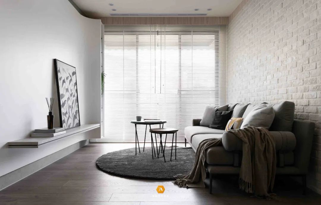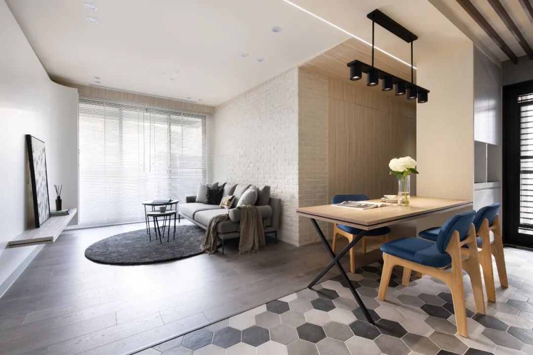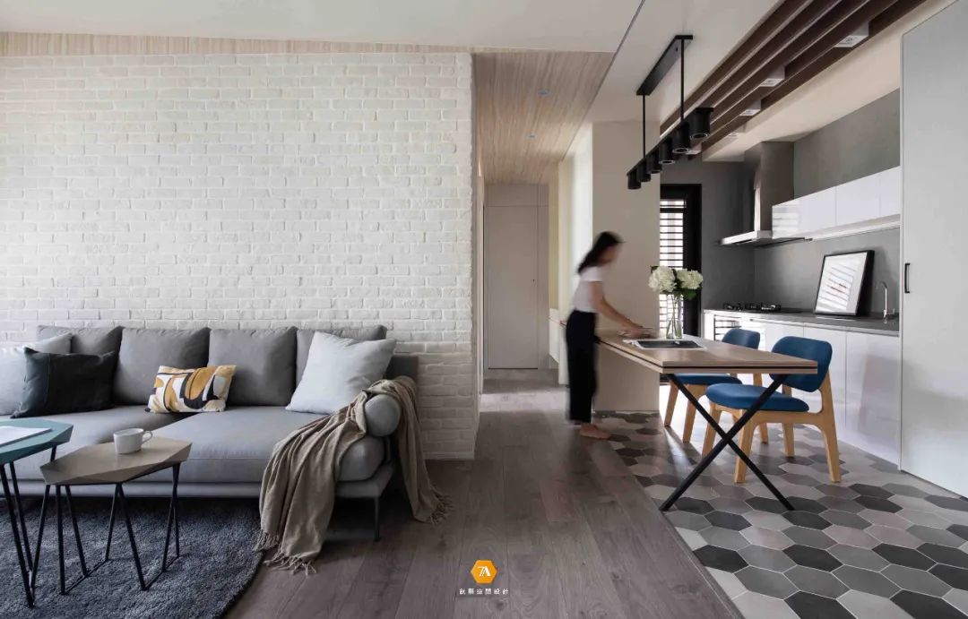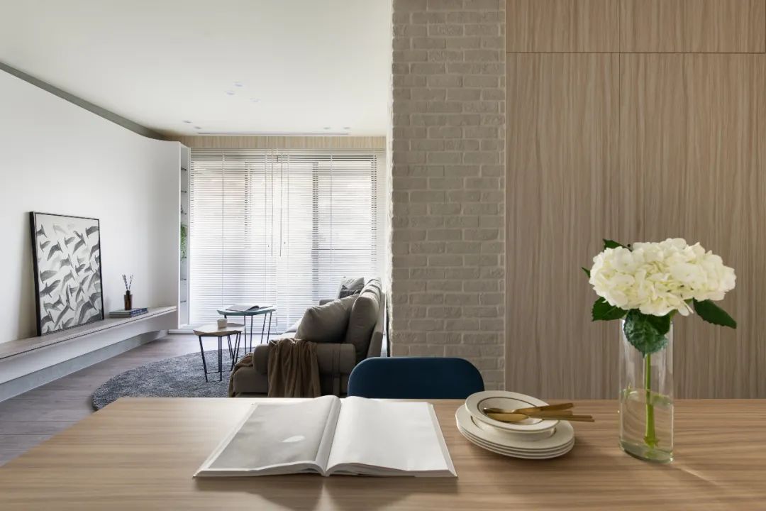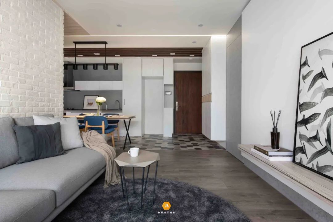 地面材質也界定出了玄關廚房和客廳的區域,設計師通過這種無形的劃分,不僅讓每個空間所具有的功能明確的表現出來,同時也使得每個空間在感受上放大。設計師在電視背景墻的設計上,采用隱藏門的設計,將電視背景墻與房門融合,在視覺上,讓整個墻面呈現出一種連續完整的感受;而沙發背景墻則采用文化磚來構建,凹凸有致的墻磚,給空間增添了不少的質感。