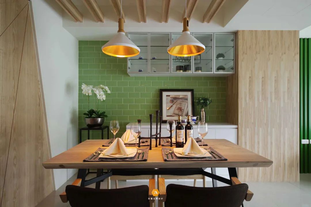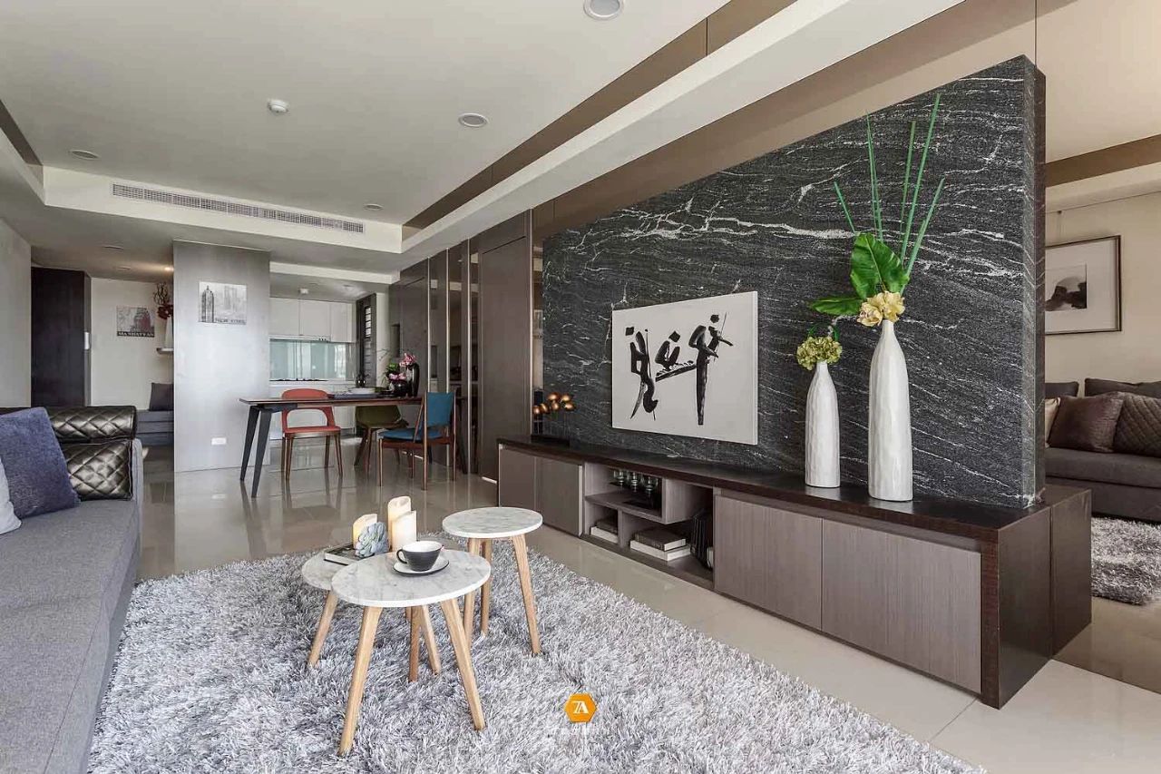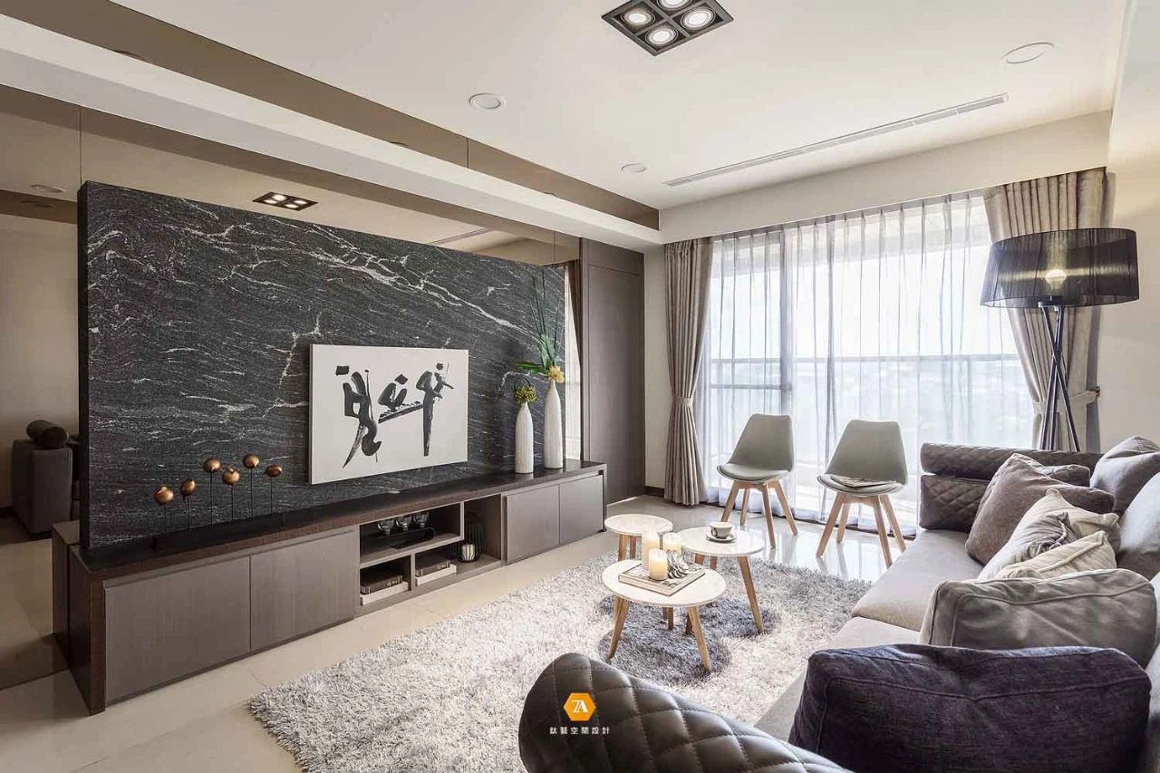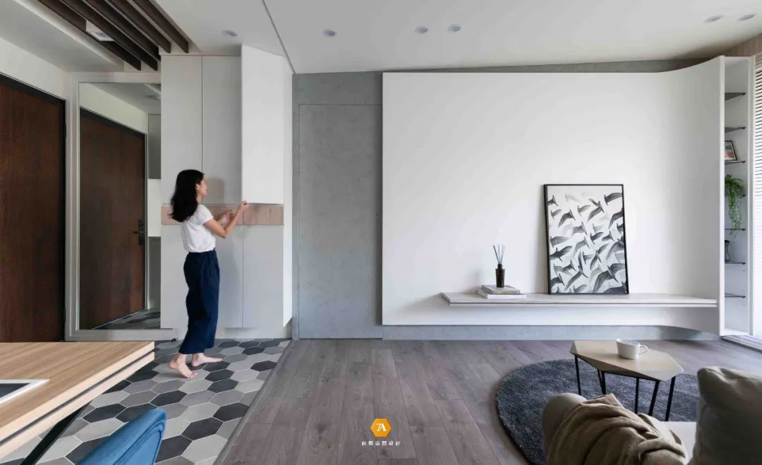 地面材質也界定出了玄關廚房和客廳的區域,設計師通過這種無形的劃分,不僅讓每個空間所具有的功能明確的表現出來,同時也使得每個空間在感受上放大。設計師在電視背景墻的設計上,采用隱藏門的設計,將電視背景墻與房門融合,在視覺上,讓整個墻面呈現出一種連續完整的感受;而沙發背景墻則采用文化磚來構建,凹凸有致的墻磚,給空間增添了不少的質感。
