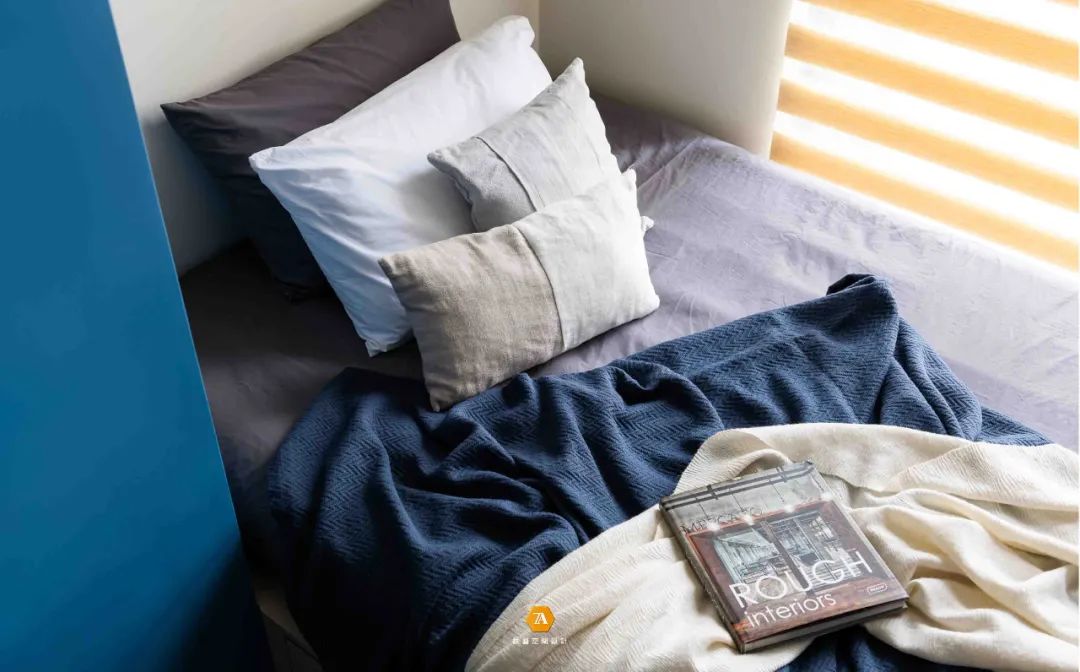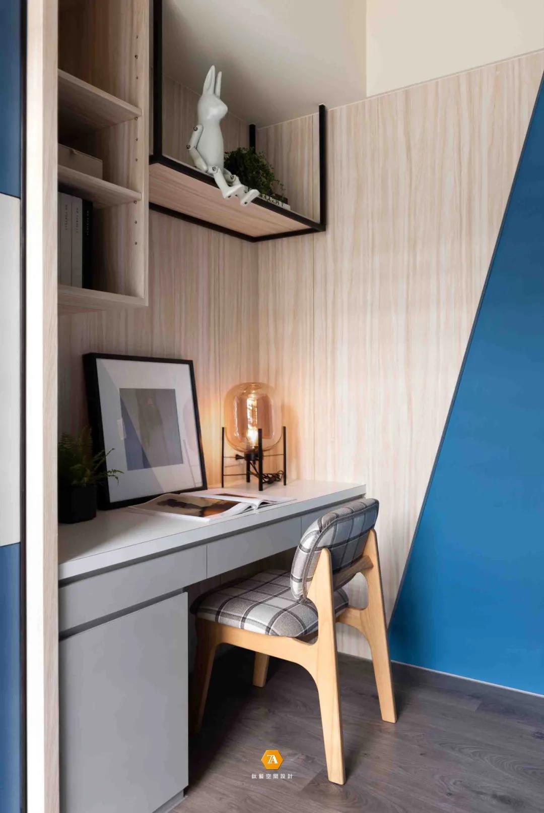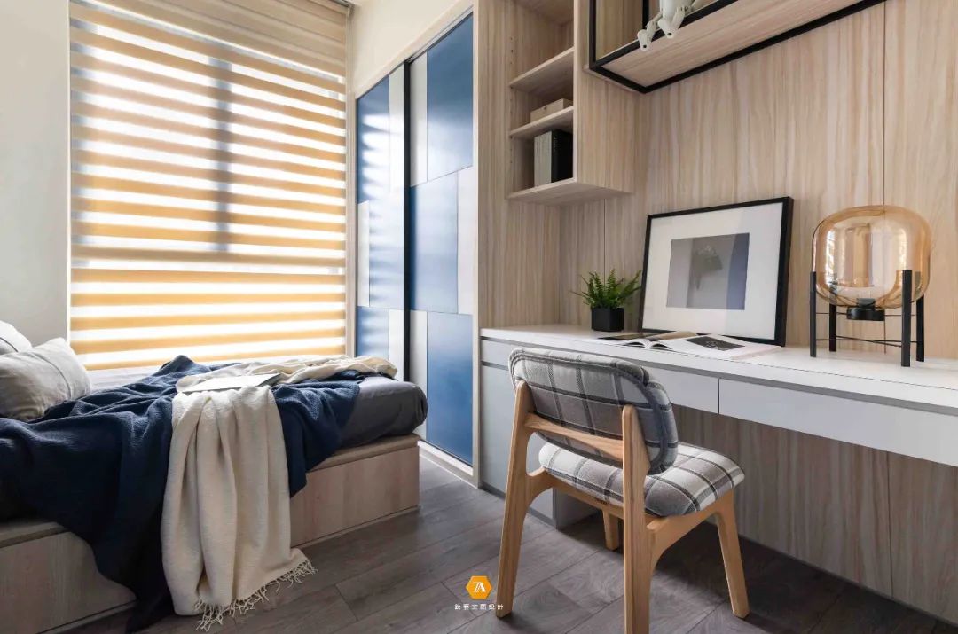 次臥在整體上以溫潤的淺色木飾面營造空間氛圍,搭配藍色的飾面材,讓空間感受溫暖活潑。