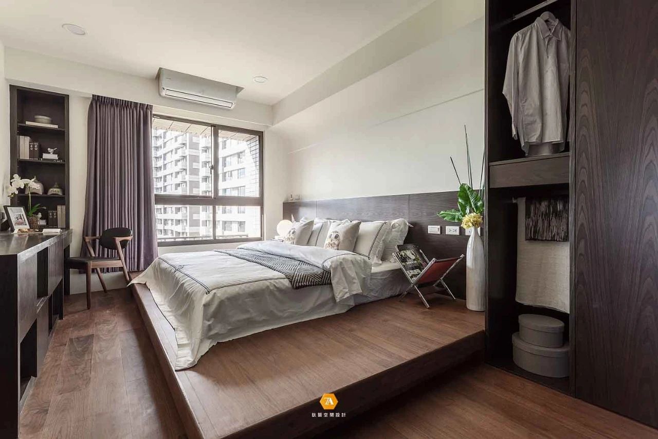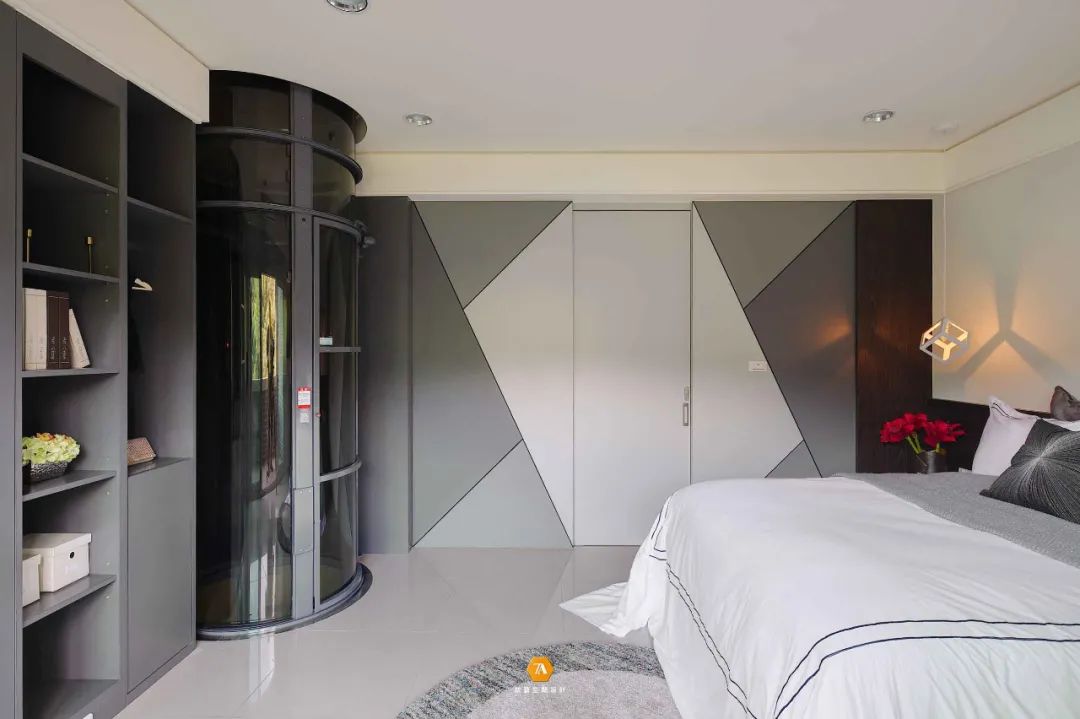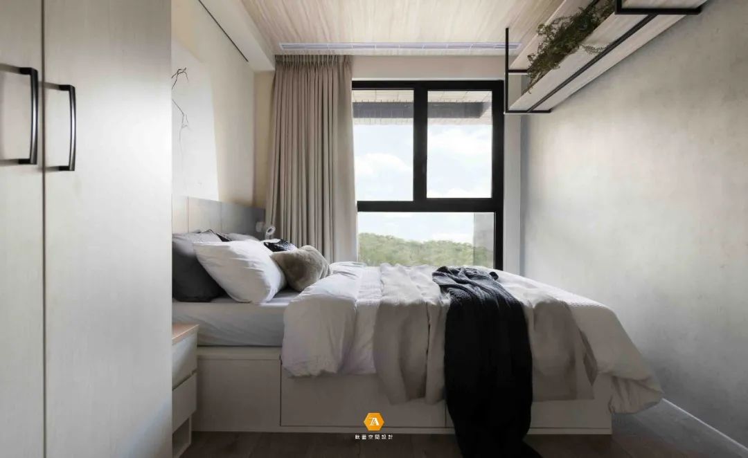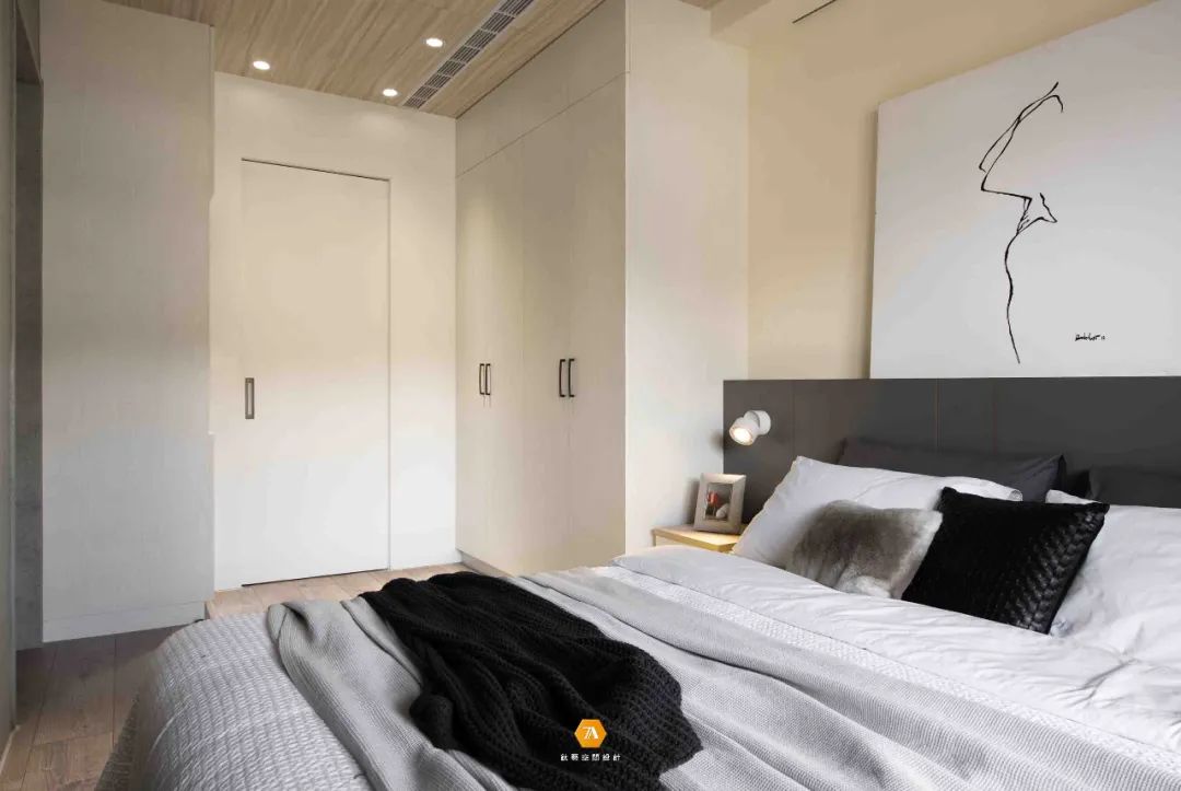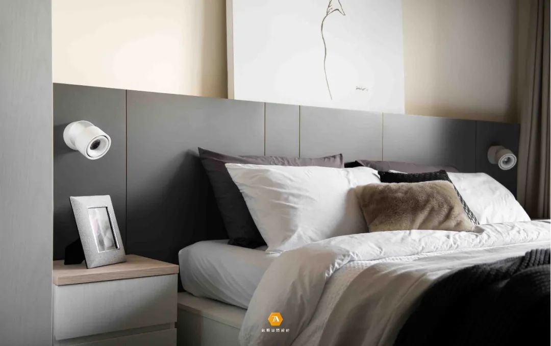 主臥在設計上則著重於營造舒適的感受,淺黃色的床頭背景與床尾淺灰色的墻面,兩種顏色搭配在一起,共同構建出一個溫暖寧靜的氛圍,使人在這一空間中,能盡情的放松自己的身心,沈浸在安靜祥和之中。